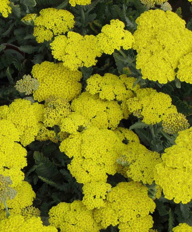 Gray green, feathery leaves all year. Wide, flat heads of bright canary yellow rise above the foliage, superb as cut flowers. Mixed borders and rockeries.