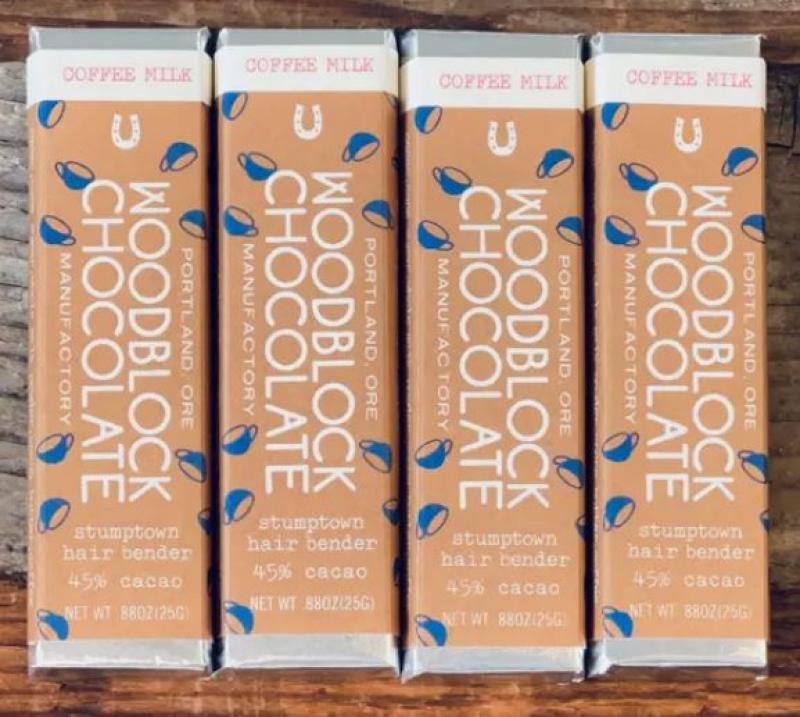It’s like Neil Young with Jheri curls doing a Dom Deluise pirouette. An artisan, blue collar, chocolate coffee speedball. We add Stumptown Roasters’ infamous Hair Bender coffee to the grinder with our Swiss style sweet 45% milk chocolate. After a two day dance marathon the blend of flavonoids come into their own and the miraculously silky texture is achieved. This chocolate bar makes your taste buds feel loved and your satisfaction bone sate. Ingredients: cacao, cane sugar, whole milk powder, cocoa butter, coffee Net WT .88oz (25g) Size: 4"x1"x 0.25"