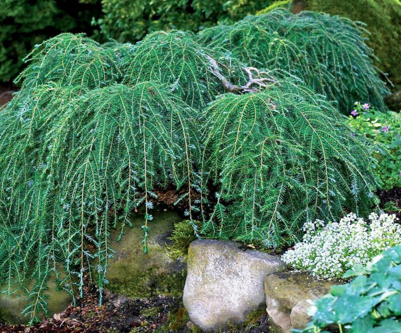 An outstanding, underutilized hemlock, Tsuga canadensis ‘Cole’s Prostrate’ is a spreading cultivar with stiff main branches that knuckle under and bend downwards to create a truly prostrate form. Gnarly interior branches show off the plant’s silver bark, which adds dimension to the exceptional, low plant. Use the garden gem to drape over or around stones or walls in a site with partial shade. Alternatively, stake the plant for some height to create all kinds of interest.