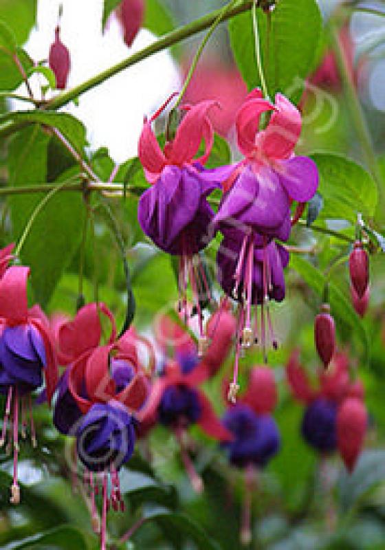 A profusion of red flowers with violet corollas grace this hardy Fuchsia from early summer until hard frost. Shapely growth habit and floriferous; attracts hummingbirds galore! Best in at least afternoon shade.
