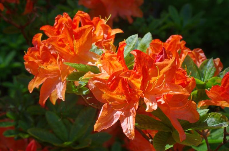 Clusters of vibrant pink and orange blooms in mid-spring