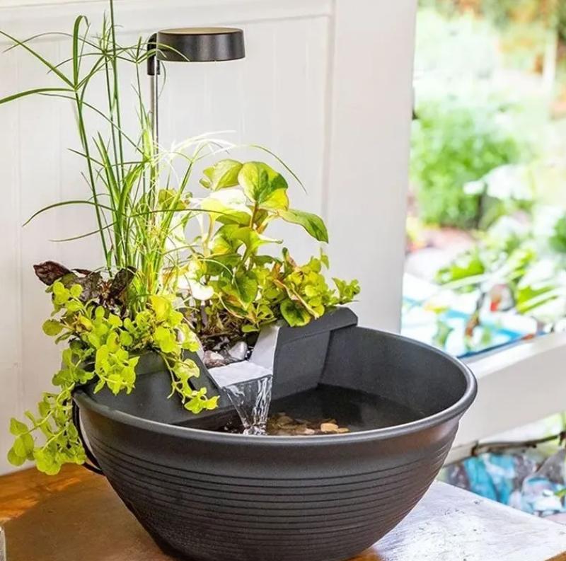 Add a compact water garden to any indoor location with the Aquascape AquaGarden Tabletop Fountain Kit. This complete kit includes everything you need to get started, and the compact size makes it a great option for any room in the house. Setup is quick and easy; simply place in your ideal location, add the included media, fill with water, and enjoy. If desired, a wide variety of plants can be added to create your very own one-of-a-kind design. The integrated plant and waterfall filter provides an ideal location for plants while acting as a biological filter to keep the water clean and clear. A tranquil waterfall provides soothing sounds and enjoyment, and the LED waterfall light can be used to illuminate the water as it cascades into the pond. The durable injection-molded pond is lightweight, long-lasting, and features a rippled, textured finish. The kit includes the container, upper filter, pump, plant light, waterfall light, controller, transformer, clay grow/biological media, and decorative gravel for both the waterfall and pond. The container measures 11.5″ in diameter and 5″ tall and holds .75 gallons of water.