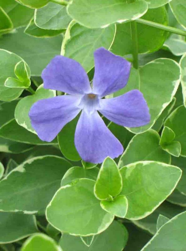 Bold and bright green and white variegated leaves trail and combine well with most other plants! Excellent in combination pots and hanging baskets. Bears periwinkle flowers spring-summer.