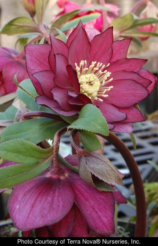 Nodding, double, vibrant dark red to rose red flowers. Evergreen, deer resistant foliage. Drought tolerant once established.