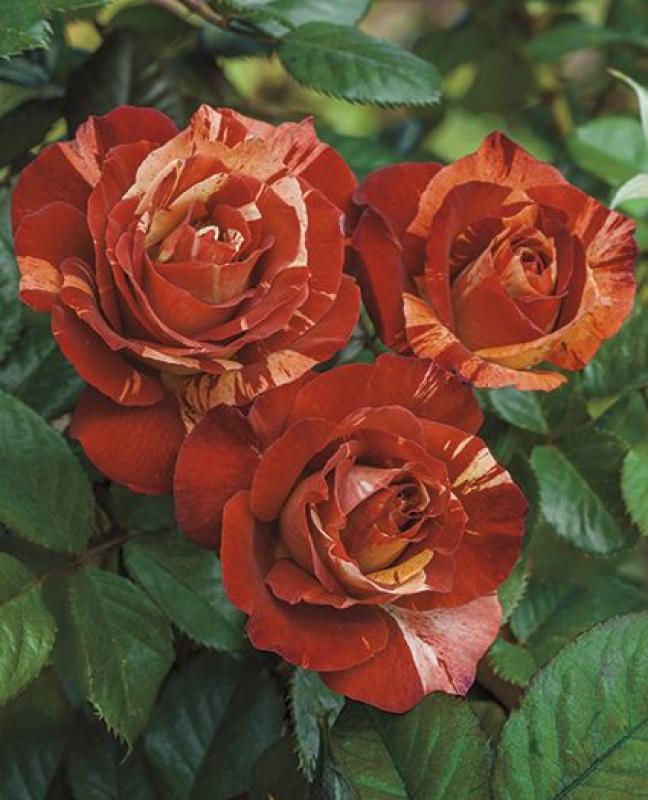 WOW! Or if you prefer FANTASTIC! Those are words describing Tropical Lightning's one-of-a-kind flower. There is really no other rose in the world that comes close to this extraordinary color blend. The tropical warmth comes in the form of rich sunset-like orange while the dazzling lightning is generated by bright cream stripes. The effect is accentuated by a layer of purple smoke creating a burnt orange combo, perfect for a stormy sky! If you are still in doubt that such colors exist, don't wait to be struck by lightning to plant this amazing Climber! Each perfectly shaped bud and flower will hold that CRAZY novel color for days and the prolific and vigorous plant, which reaches mature size and full display in 3 years, will only slow down the flowering as it transitions into winter. If the extraordinary bloom colors were not enough, Tropical Lightning presents some of the glossiest leaves of all roses. Add the dark burgundy red coloration of the new shoots and we will all wish for an endless tropical storm!