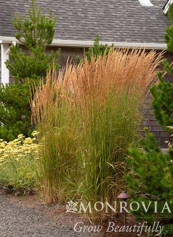 Tall, upright, feathery spikes with bronze tones dry to a golden buff color. Medium green, wide blades. Background, specimen or in masses in borders.