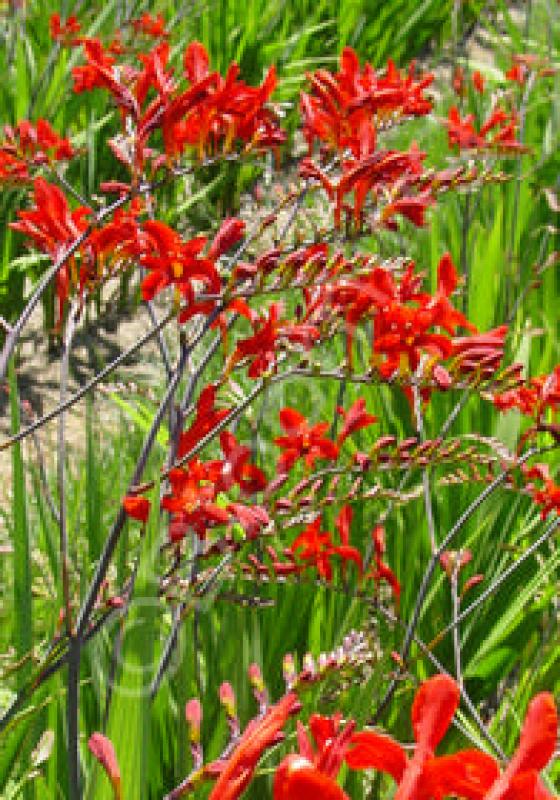 Dramatic, deep red tubular flowers arch up tall stately stems, drawing hummingbirds from far and wide. Blooms mid to late summer. Grows best in rich, moist soil.
