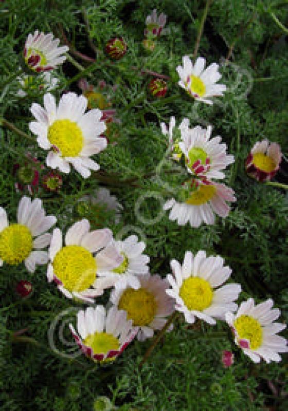 Gray-green filigreed leaves form a prostrate mat. White daisies with maroon reverse sides appear in abundance. Blooms May through fall. Excellent groundcover or rockery specimen. Full sun and well drained soil.
